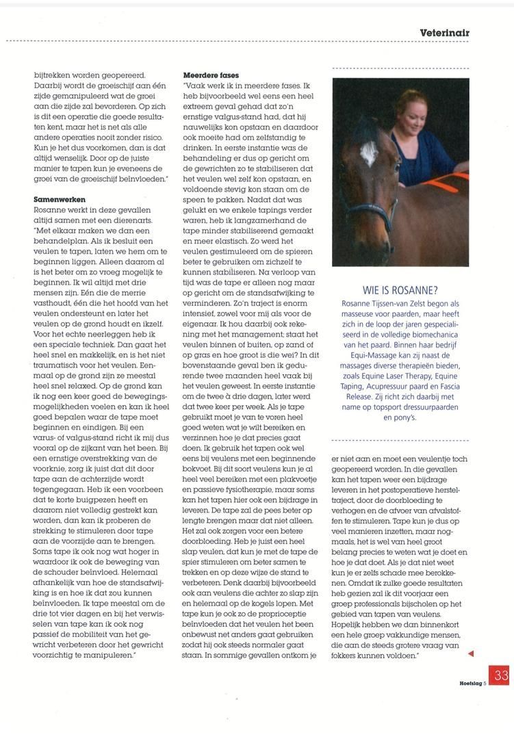Ik ben teamlid van het Veulenteam van Rosanne Tijssen-van Zelst. Rosanne heeft het tapen van veulens in Nederland geïntroduceerd en heeft zich hier verder in ontwikkeld/ gespecialiseerd. Omdat de aanvragen door heel Nederland binnenstromen, heeft Rosanne gediplomeerde paardensportmasseurs opgeleid voor het tapen van veulens. De aanvragen voor het tapen van veulens verlopen via Rosanne. Rosanne coacht de teamleden rondom het maken van behandelplannen.